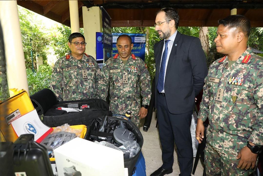 The handover ceremony saw Mr. Enrico Boninsegna, UNODC Head of Office in the Maldives, present the equipment to Brigadier General Mohamed Saleem, Commandant of the MNDF Coast Guard.