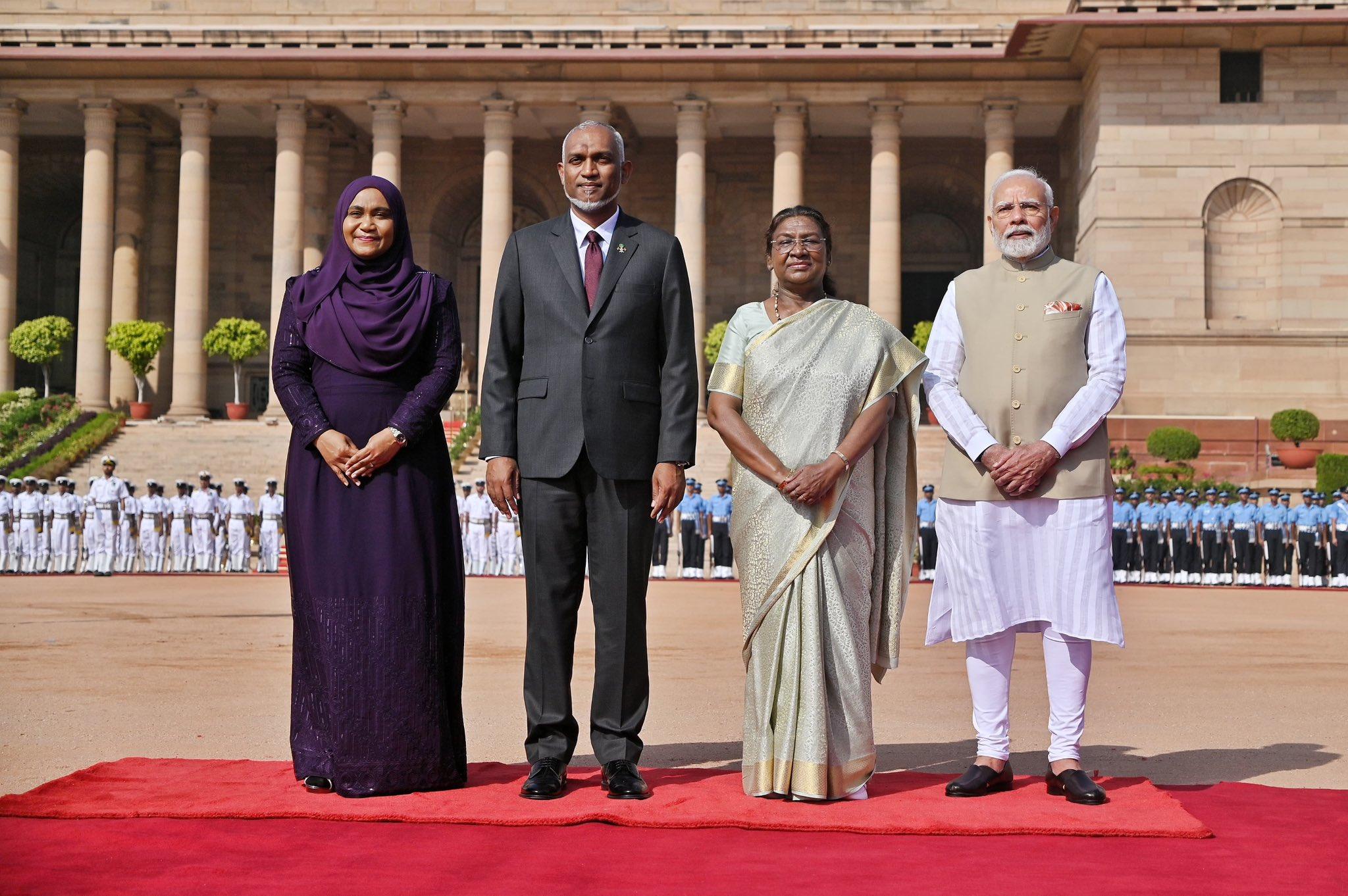 President His Excellency Dr Mohamed Muizzu and First Lady Madam Sajidha Mohamed were accorded a ceremonial welcome this morning at Rashtrapati Bhavan, in New Delhi, India.